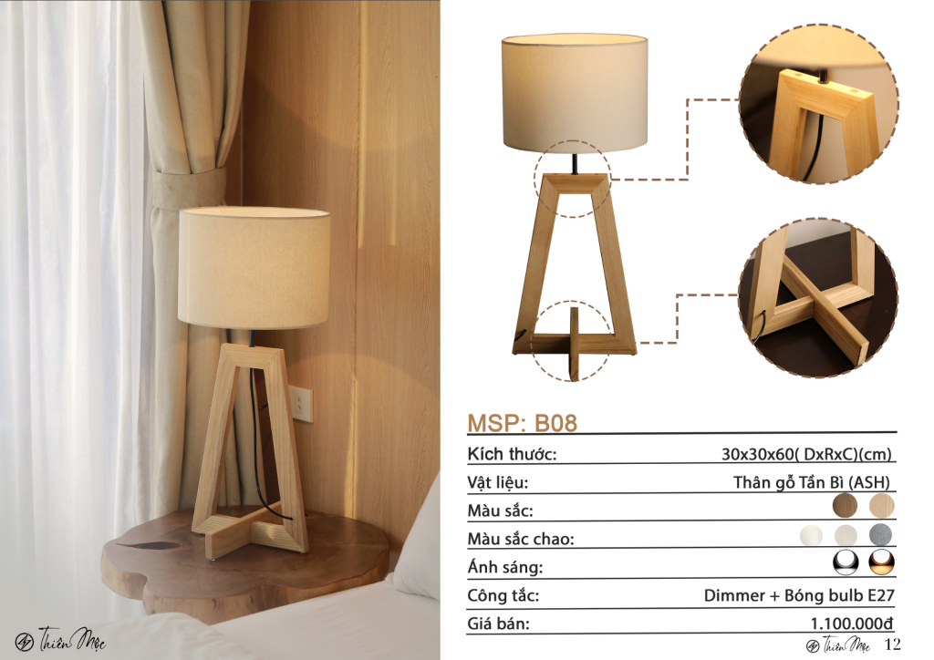 Phần chao đèn vải hình trụ tròn có kích thước cân đối với thân đèn, giúp ánh sáng lan tỏa dịu nhẹ, không gây chói mắt, tạo cảm giác ấm cúng và thư giãn. Nhờ thiết kế nhỏ gọn, B08 dễ dàng phù hợp với nhiều không gian như bàn làm việc, bàn trà hay đầu giường, mang đến điểm nhấn tinh tế mà không chiếm quá nhiều diện tích.